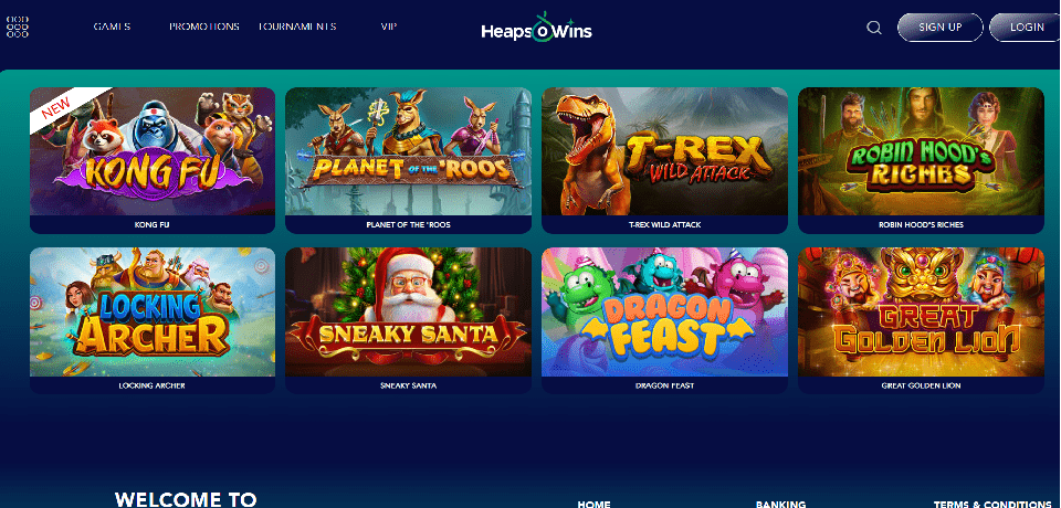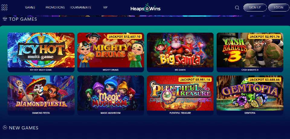 All of the hundreds of slot games from Real Time Gaming are available on Heapsowins. Games developed by third parties are not available at this casino. Select "Games" from the menu on the left to access the game catalogue. There are six main parts to the catalogue: Our Popular Picks" features a curated collection of top-rated RTG games; "Video Slots" houses all of RTG's slot games; "Card Games" offers a limited selection of card games like poker and blackjack; "Specialty Games" features a handful of entertaining mini-games to try; "Jackpot" offers a chance to win one of RTG's progressive jackpots, which can reach hundreds of thousands of dollars; and "All Games" provides access to RTG's full library of casino games. Sorting the games by features and themes makes it easy to locate one you would love.