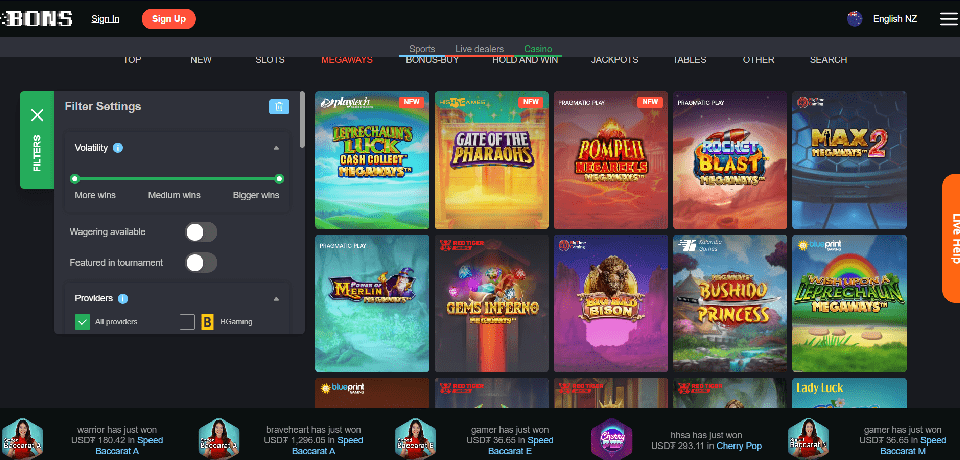 Slots, Megaways, Bonus-Buy, Hold and Win, Jackpots, and Tables are some of the convenient game categories that players can use to traverse the casino.