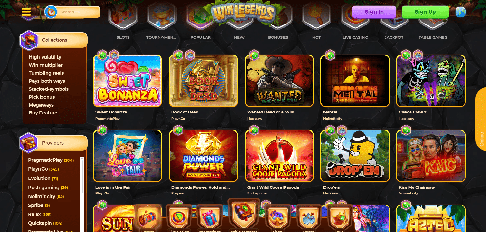 Slot games predominate in WinLegends's catalogue, which you can browse by provider, volatility, or feature. Many mini-gmes have recently been popular, such as Aviator, Plinko, Hotline, Goal, Heads&Tails, Space XY, and many more.